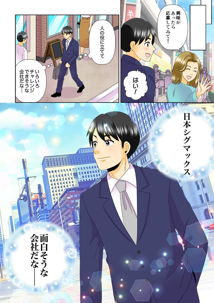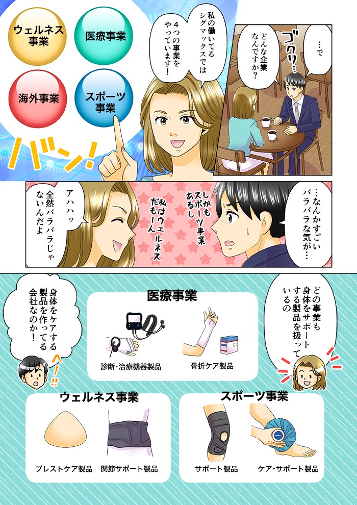この採用マンガの企業情報 日本シグマックス株式会社 医療ヘルスケア 本社 東京都新宿区西新宿1-24-1 エステック情報ビル7F(総合受付8F) 資本金 9000万円 売上高 143.7億円 (2025年3月期) 従業員数 246名 (2025年3月末時点) URL https://www.sigmax.co.jp/recruit/ 記事公開日:2026/02/24 この記事を読んだあなたにおすすめ2020年2月12日 私たちと一緒に、幸せをつくりませんか?2026年2月10日 マンガでわかるVSGクリアビジョン ~営業職編~2026年2月10日 マンガでわかるVSGクリアビジョン ~新入社員編~2026年1月27日 マンガでわかる 第一電材エレクトロニクスの魅力